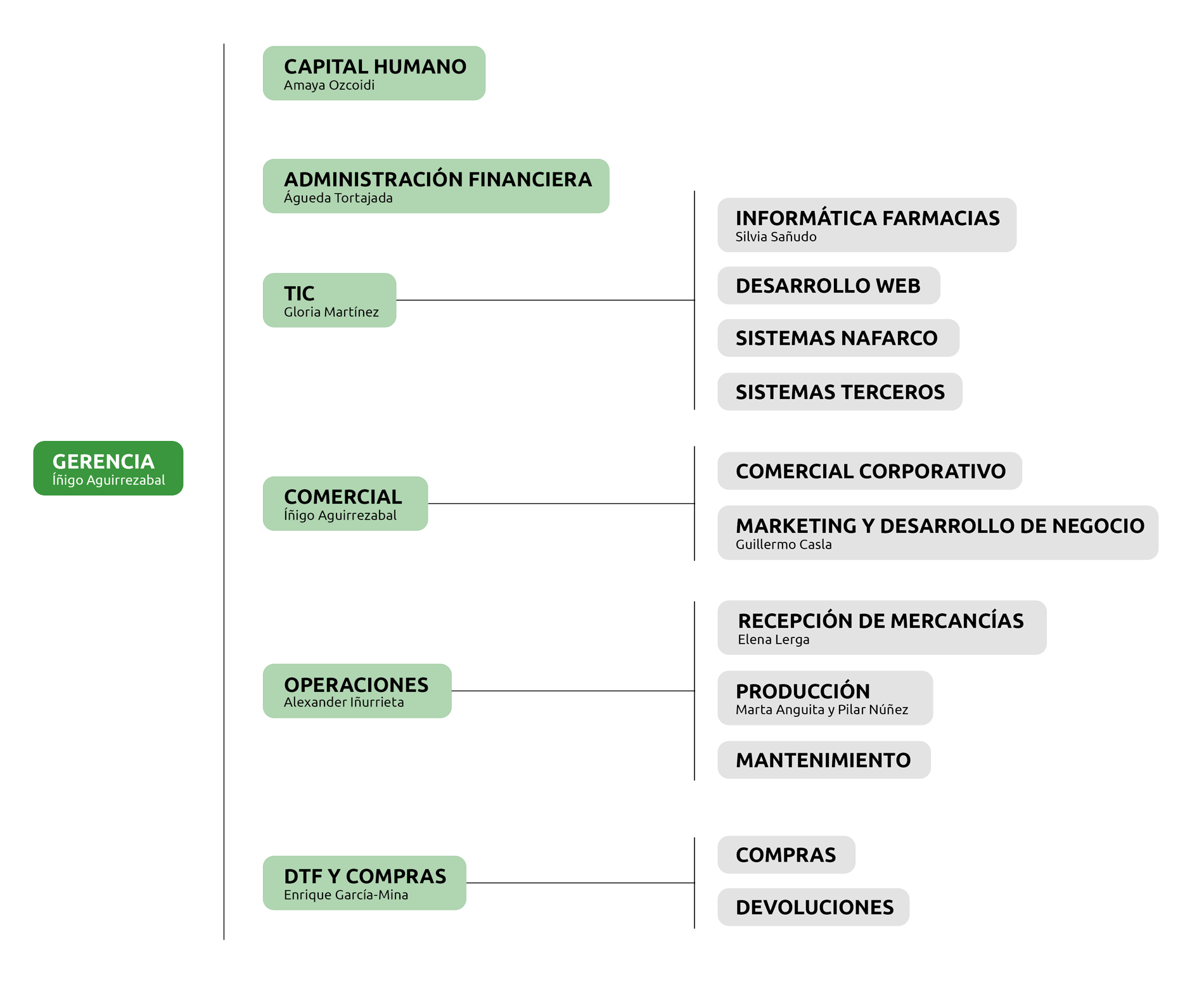 Nivel 1: Gerencia:  Íñigo Aguirrezabal Nivel 2: Capital Humano:  Amaya Ozcoidi Administración Financiera:  Águeda Tortajada TIC:  Gloria Martinez Comercial: Íñigo Aguirrezabal Operaciones:  Alexander Iñurrieta DTF y Compras: Enrique García-Mina Nivel 3: TIC · Informática Farmacias: Silvia Sañudo · Desarrollo Web · Sistemas Nafarco · Sistemas Terceros Comercial · Comercial Corporativo · Marketing y Desarrollo de Negocio: Guillermo Casla Operaciones · Recepción de mercancías: Elena Lerga · Producción:  Marta Anguita y Pilar Núñez · Mantenimiento Aprovisionamiento DTF y Compras · Compras · Devoluciones